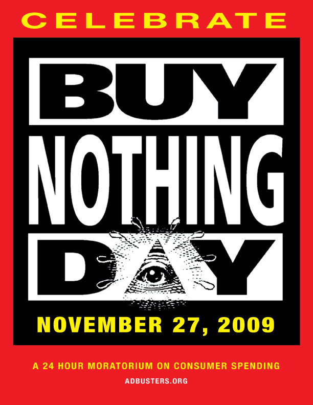 Make plans now to celebrate Buy Nothing Day next Friday, November 27th . You don’t have to spend “Black Friday” in a haze of consumption, waiting in long lines amid frenzied crowds. You can fight back and make a statement against our materialistic society! Instead of heading to the stores, relax and spend time with family and friends, engaging in meaningful activities that consume minimal resources.