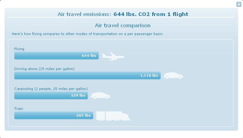My round trip flight will produce 644 pounds of CO2. That’s just for me; the flight’s total CO2 emissions will be 644 x the number of seats on the flight. How does this compare to other ways of getting to DC? When I click details, I see this comparison: