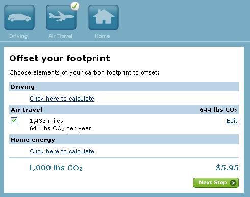 So, how much does it cost me to offset the flight? I clicked, “Or skip to results,” in the first image, and was surprised to find that I could purchase offsets for 1000 pounds of CO2 (more than I was emitting) for only $5.95.