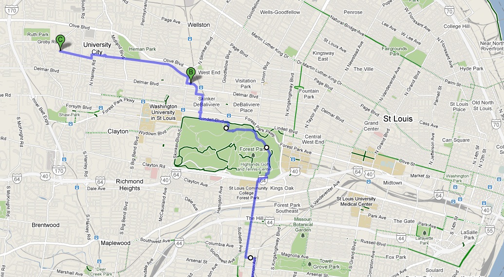 Last night’s Green Drinks at the Green Center in U-City was kind-of far away, and there was a chance of rain in the forecast, but I’d made up my mind to bike there. Then I plotted a route and saw that it was 10 miles, one way. Twenty miles in one night when I’ve been doing very little riding (other than the sitting on my butt in the car variety)? Gulp.
