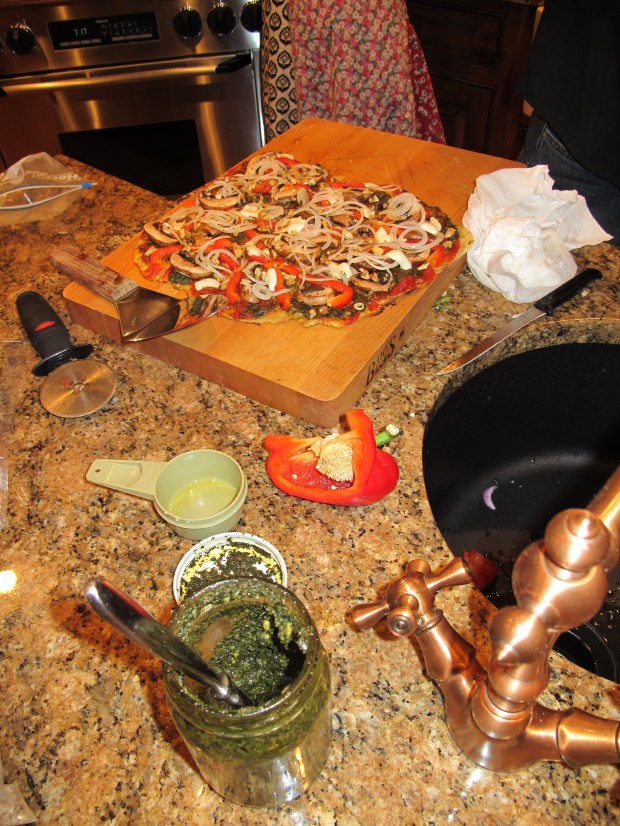 My pizza contribution involved a combo of homemade pizza sauce and pesto as the base, topped with red bell peppers, mushrooms, onions, and walnuts.  Tom suggested the walnuts, and they added a lovely crunch.  I added some small pieces of fresh mozzarella, keeping it low cheese.