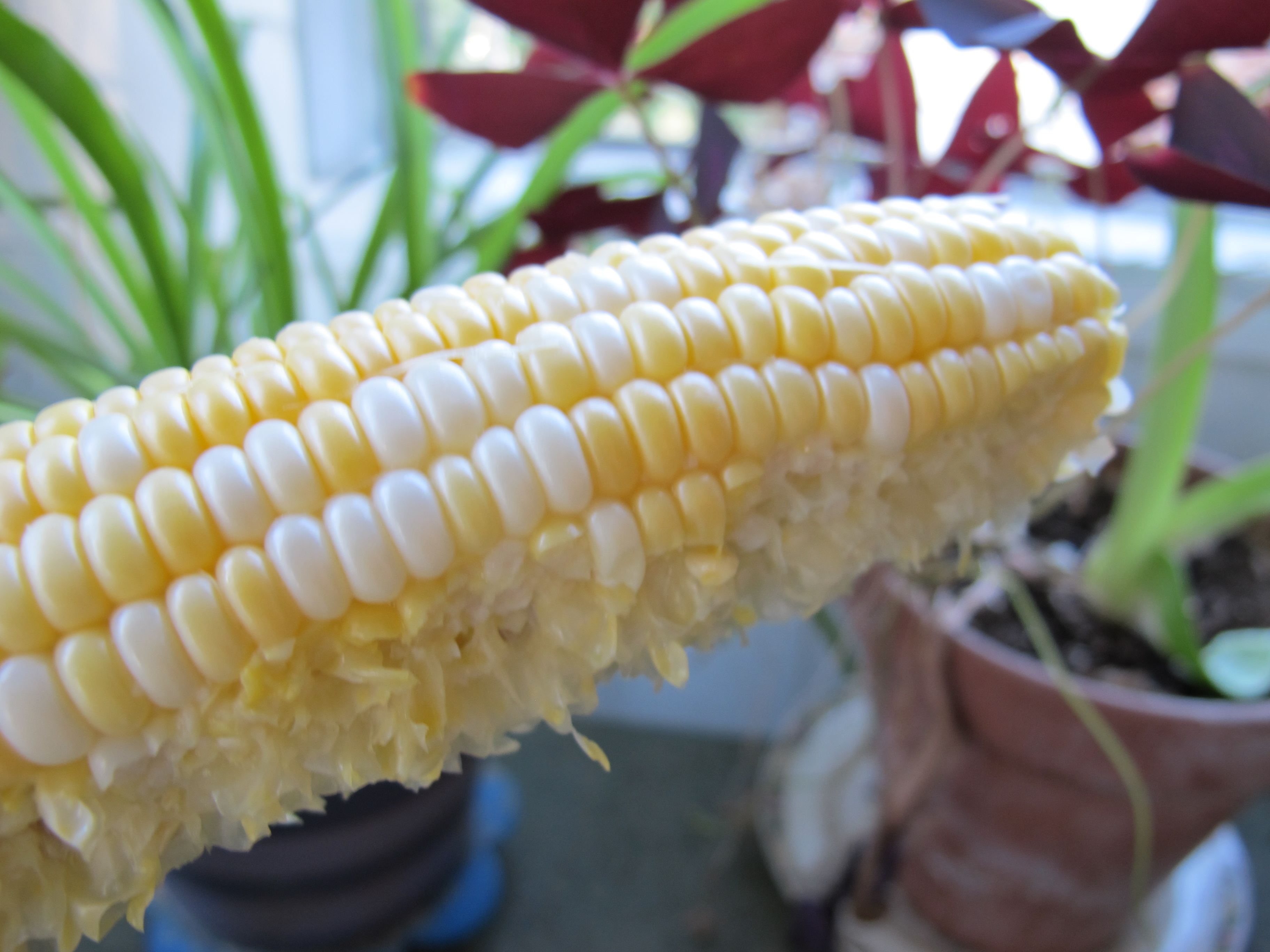 If you buy really fresh (i.e., picked that day, or maybe the day before) local sweet corn, try eating it raw for a refreshing treat. Fresh corn (sans fungus) graced our dinner plates last night, and I was well into my ear when I thought to take a picture.