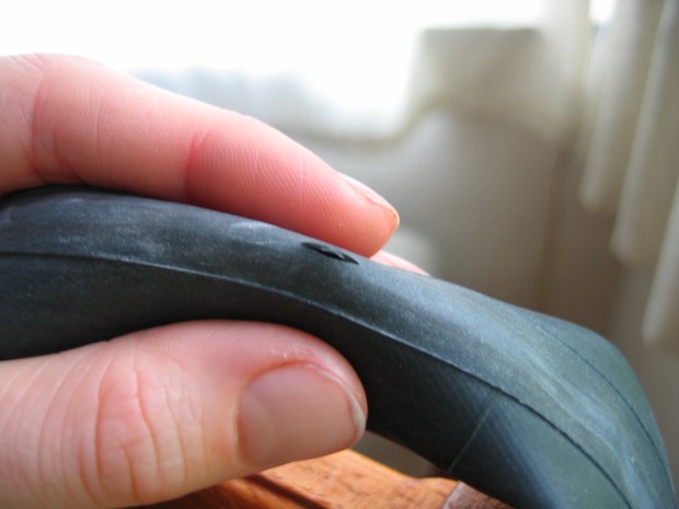 I didn’t need a sink full of water to find this guy; it jumped right out at me when I inspected the tube this morning. I patched it up, and I’ll go ahead and swap the repaired tube for the brand new one that I put in last night so I can have the new one as a back-up again.