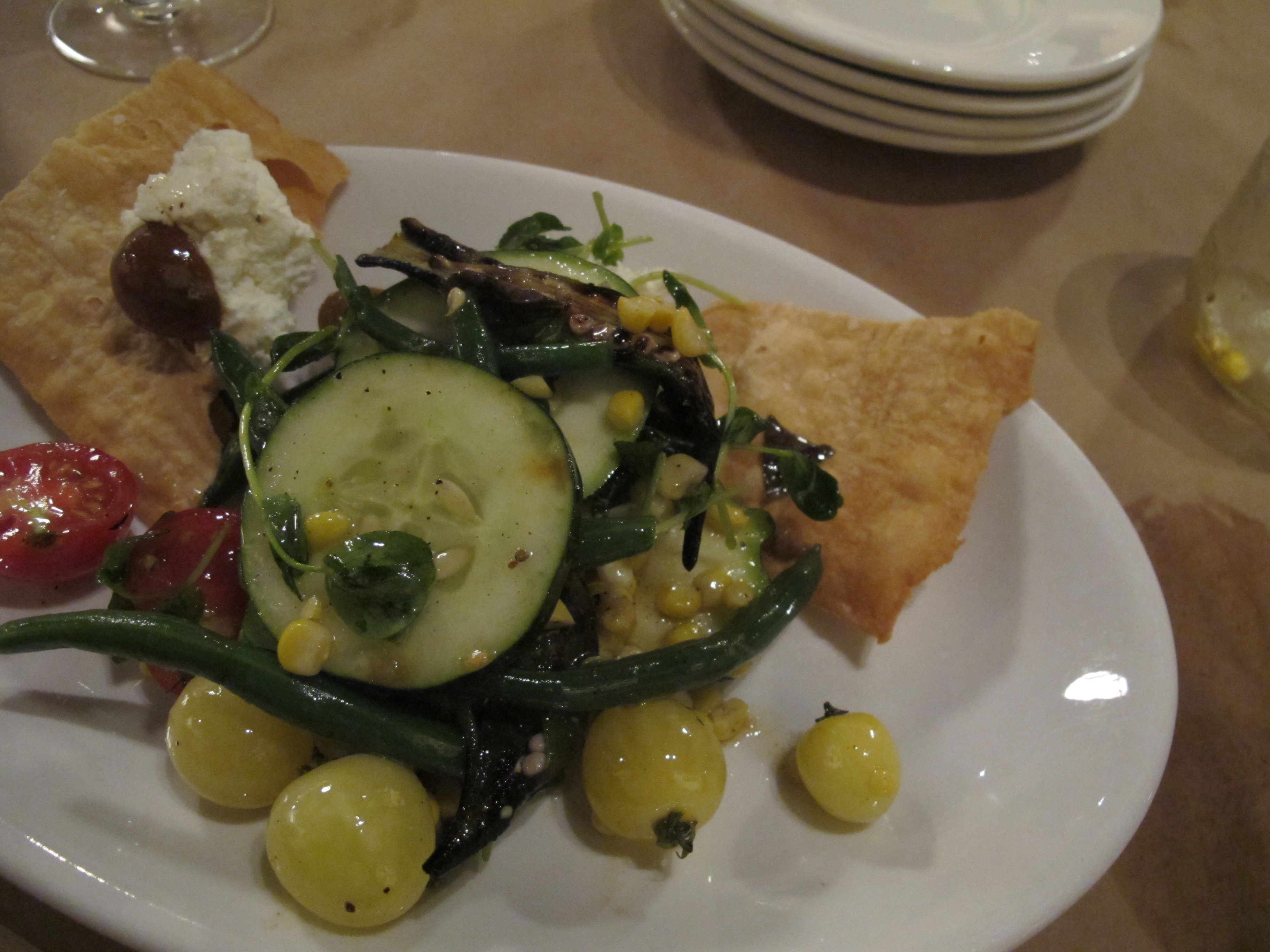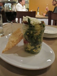 It arrived in a canning jar — fun! For ease of eating we dumped it out on the plate. A flavorful and fresh start to our meal, the corn melted in my mouth, buttery and sweet, a nice compliment to the other veggies.