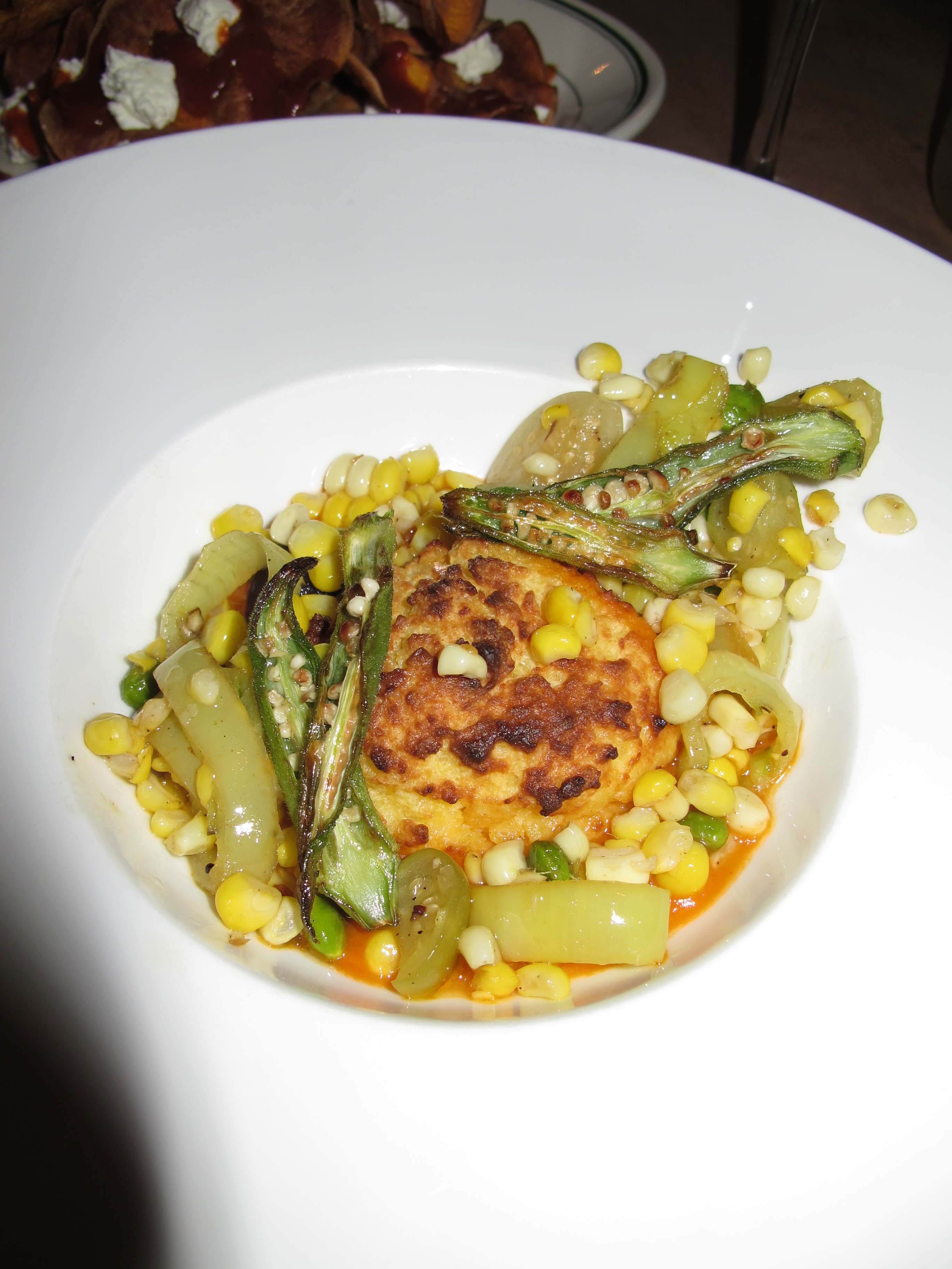 For our entree, we shared the vegetarian succotash, tomatillos, grilled okra, corn, and peppers, served over spoon bread. Mmm, spoon bread — my first, but definitely not my last, encounter with this food. We ate this and were very sad that we couldn’t lick up the last bits in the bowl 😦 In some cultures, that’s considered very polite.