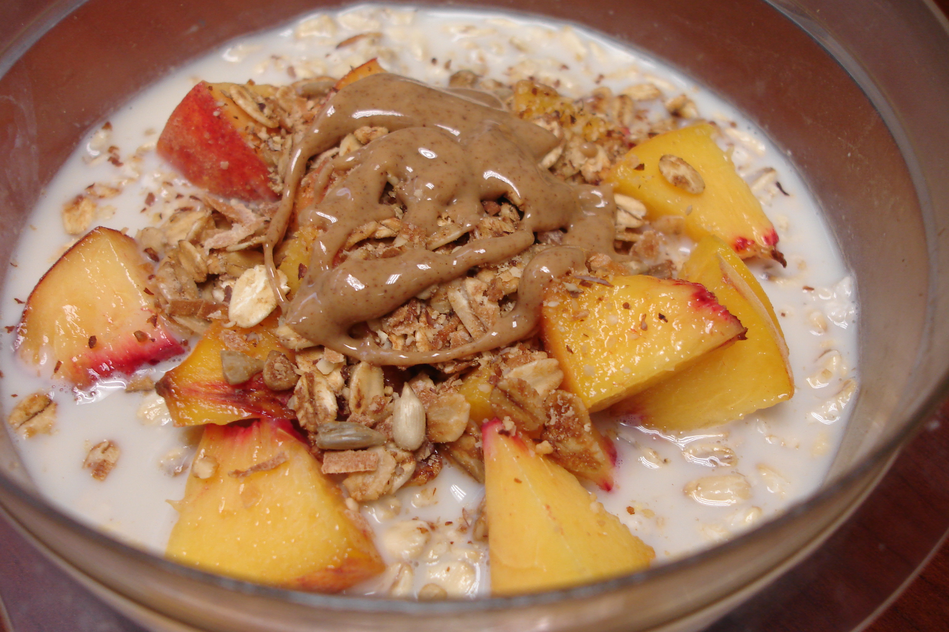 This is NOT my ordinary oatmeal, but a no-cook, to-go version: 1/3 cup rolled oats soaked in soy milk (perhaps a bit too much milk in the photo above) for a couple of hours. Topped with sliced local peaches, homemade granola, and almond butter. I added a touch of maple syrup to the last few bites.