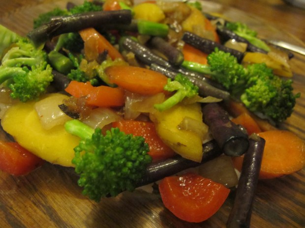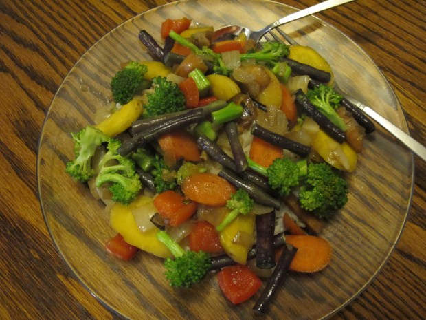 One suggestion for eating a variety of vegetables and fruits: eat something from every color group every day. Sometimes it just happens to all come together in one meal.