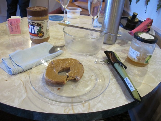 While a free breakfast is sounds good in theory, hotel continental breakfasts are rife with waste and low quality food. In addition to our water bottles, bamboo utensils, real plates, cloth napkins, and glass bowl, I brought a baggie of rolled oats and a jar of peanut butter. I combined my food with a hotel bagel to round out breakfast and snagged some of their dry breakfast cereal for a later snack.