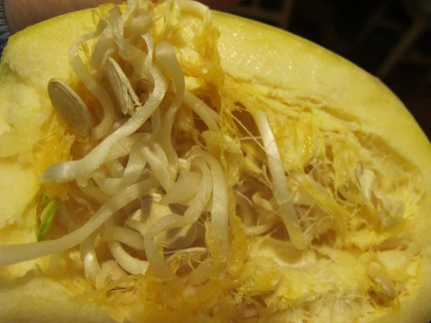 I’ve been eating A LOT of pasta lately, so in an effort to mix things up a bit, I decided to prepare a spaghetti squash. I cut into it, and was surprised to see that the seeds had sprouted.