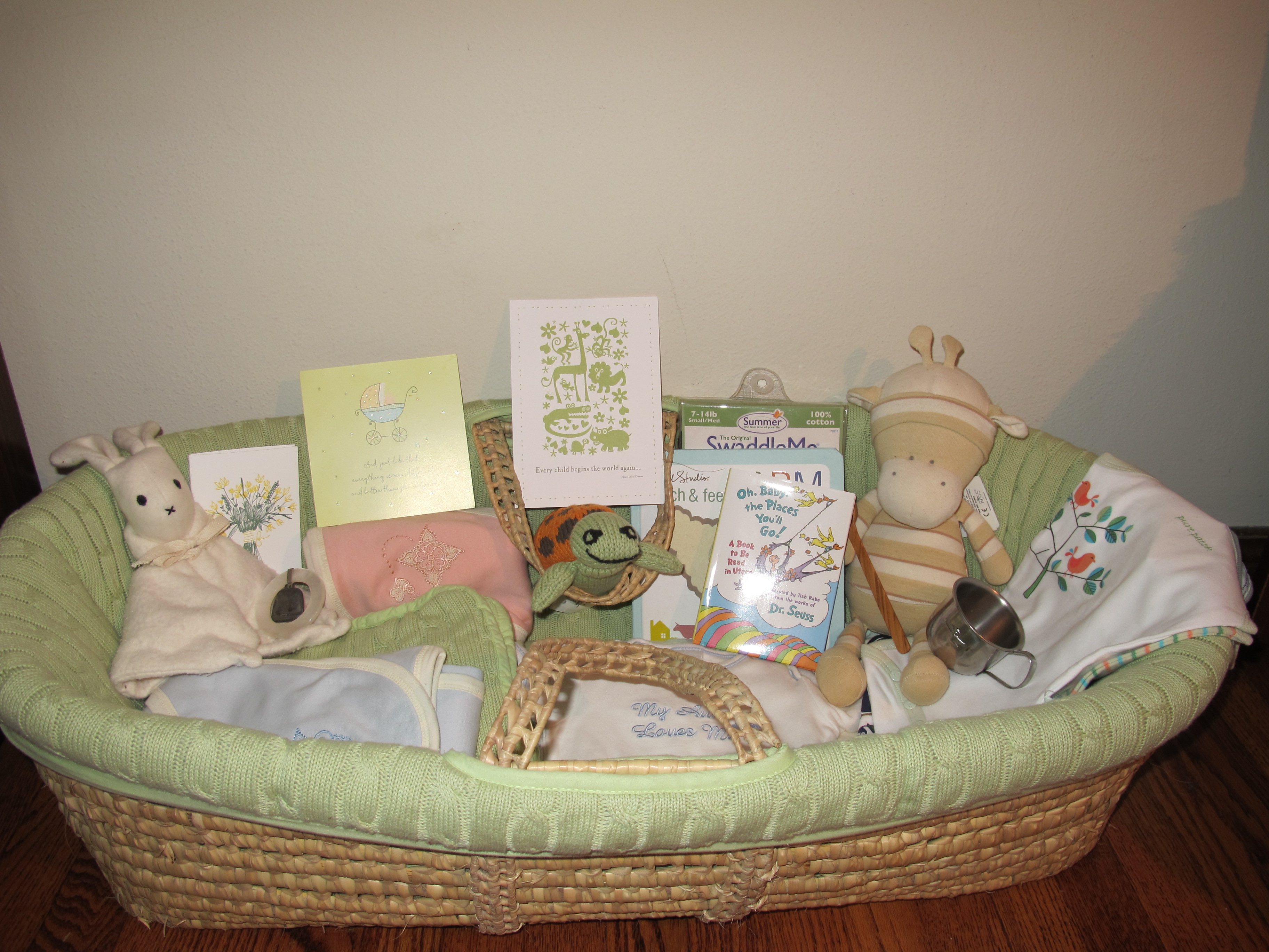 For now, our small collection of baby “things” fits nicely in this Moses basket that we found used at Kangaroo Kids. We’ll use the basket as a daytime sleeping place that we can keep near us when we’re not using a sling. Arranging the basket was fun and assuaged some of my “bad mama” guilt. When the time comes, we’ll have the basics covered, and we’ll provide a loving, nurturing family and home — something that all the money in the world can’t buy!