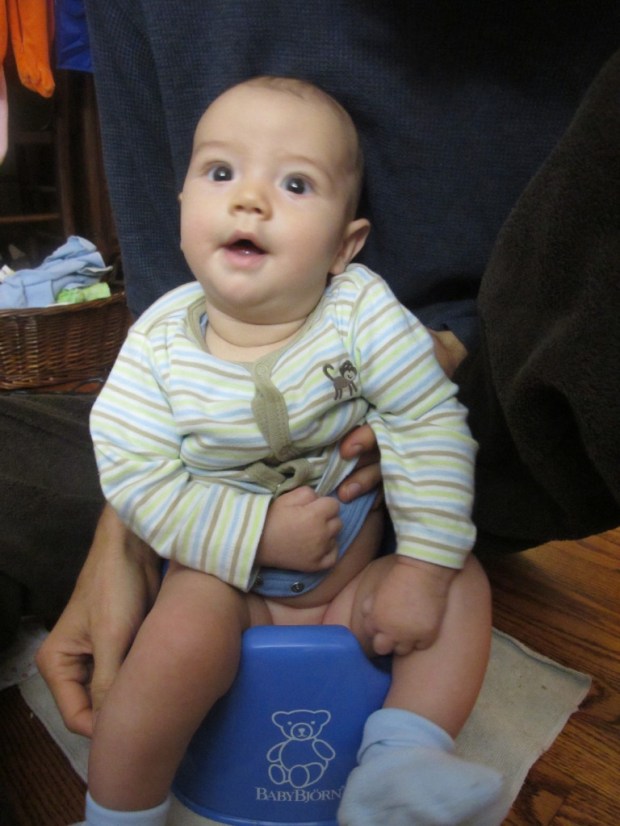 I’m a bit overdue for this post — the “three months” part of the title is quickly becoming dated — time to write!  We’ve made a good bit of progress since my first Elimination Communication (EC) post.  While he’s still most definitely in diapers, Gabriel pees and poops on his potty regularly when we’re at home, and we’ve had some 24-48 hour stretches with only one or two wet diapers 🙂