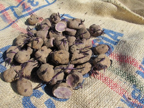 This year, we saved our own seed potatoes. This basically means we selected some of each variety from last year’s crop, set them aside (so they didn’t get eaten), and then, a few weeks before planting, let the eyes grow.