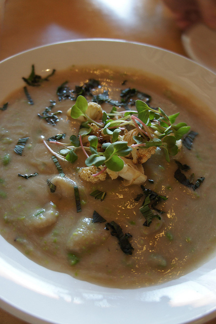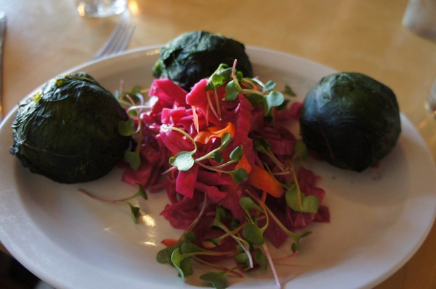 Matthew and I split the house made gnocchi in cauliflower-pea soup (above), which was that evening’s green plate special, and the chard-wrapped tamales with mushroom filling, served with a side of purple slaw (below). I love the colors on the tamale plate.