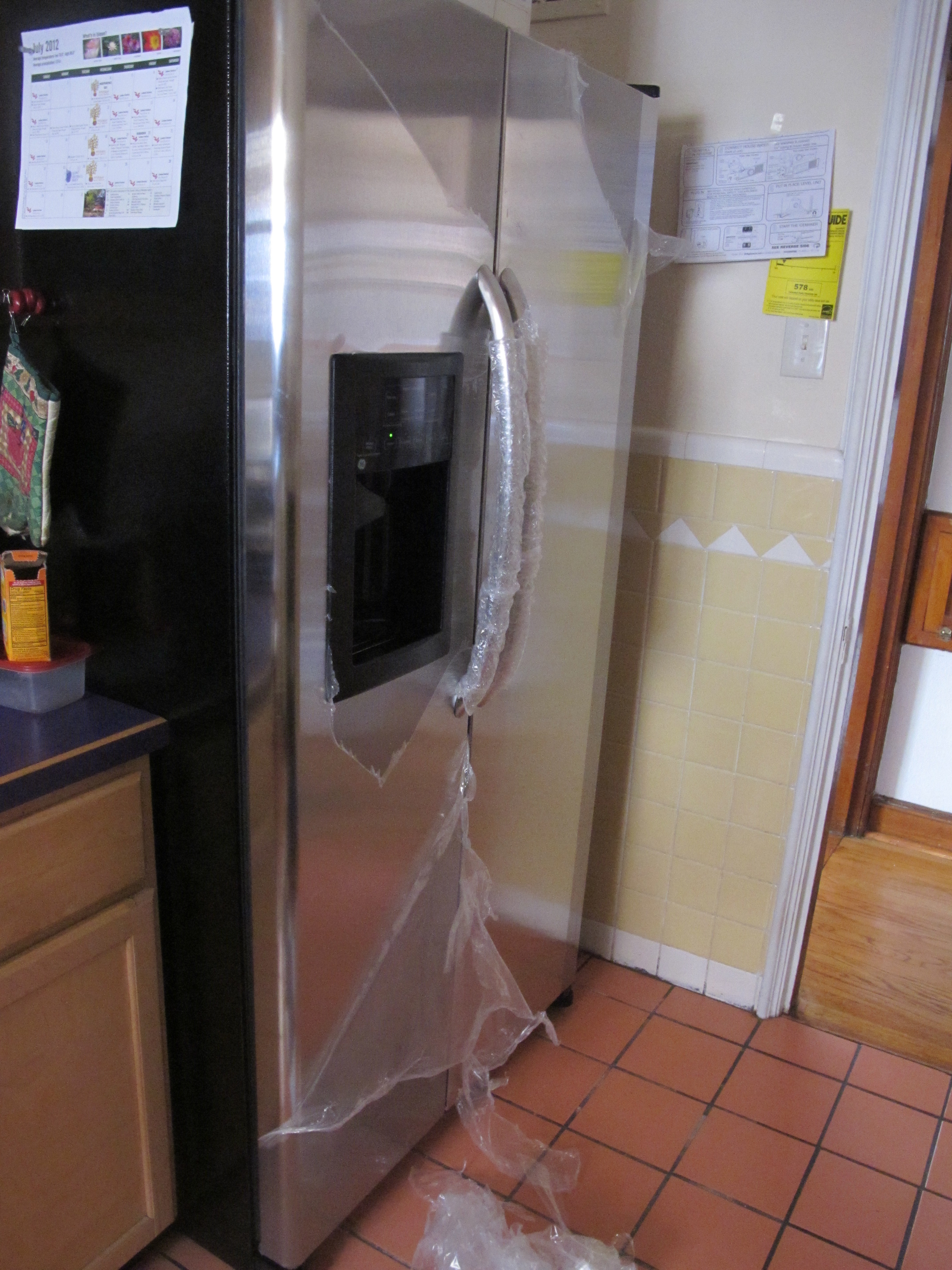 Fortunately, our landlord was there to handle the delivery. I returned home to my lovely shrink-wrapped fridge.