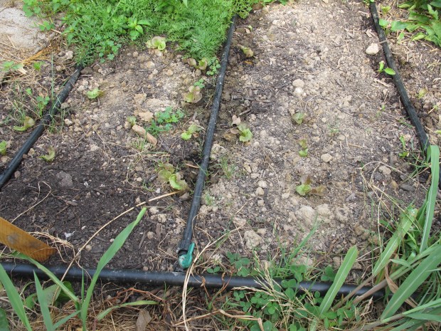 I debated drip tubing vs. drip tape, but the tape costs about a quarter as much and was available as lower flow with more emitters per linear foot and theoretically lasts pretty well.   I decided that the tape was worth a try, especially since the price of doing the whole garden with tubing would have been a much larger expense, and the benefits of the system are greatest with as much of the garden covered by it as possible.