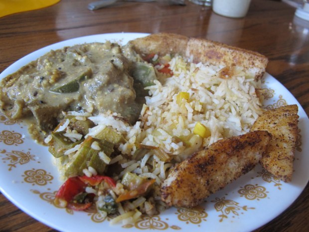 Egg biryani, pan fried idlis, and a delicious eggplant dish, courtesy of Nupur at One Hot Stove