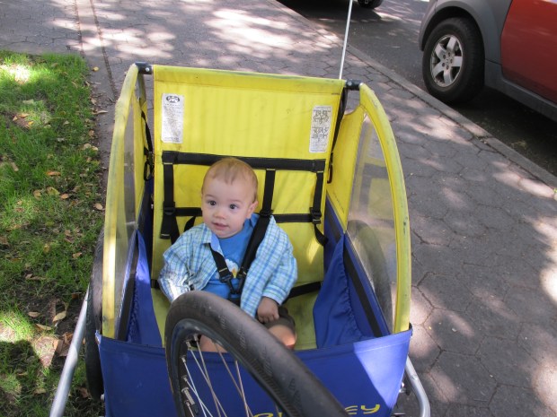 Unfortunately, as Matthew was shifting on the uphill approach to the bridge, his chain derailed.  Hot midday sun, chain wedged tightly, tired and uncomfortable baby, stressed parents, and baby falling asleep in trailer and being rudely awakened combined for a not so great return trip and the decision to trade in the bikes for feet for the rest of that day.
