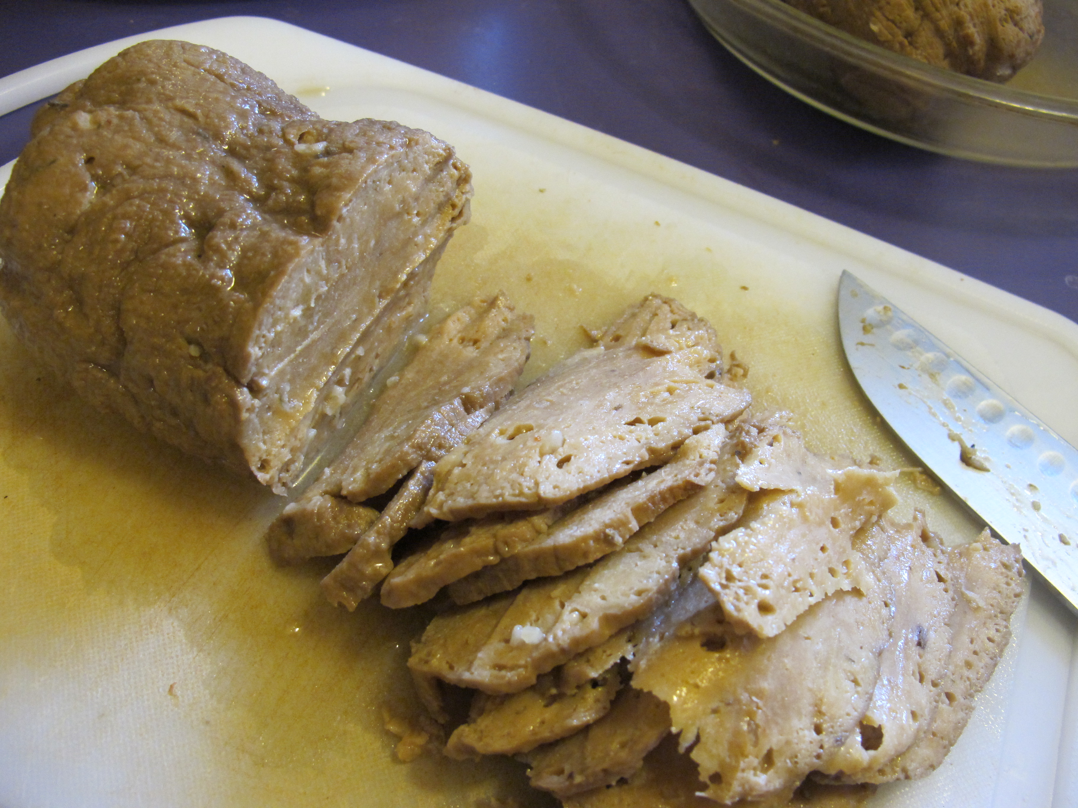 Half pleased, half horrified, and a good dose of overwhelmed at the sheer quantity of seitan I had created, I set about the task of slicing it — some ultra-thin slices for sandwiches and some chunks for other dishes.