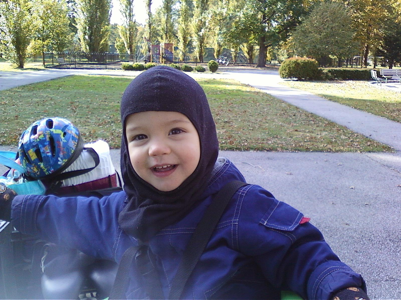 While we’re still in cool fall weather and not cold winter weather mode, yesterday’s morning bike ride prompted an impromptu solution for staying warm on the bicycle.  My balaclava was only a tad big on little Pookie.