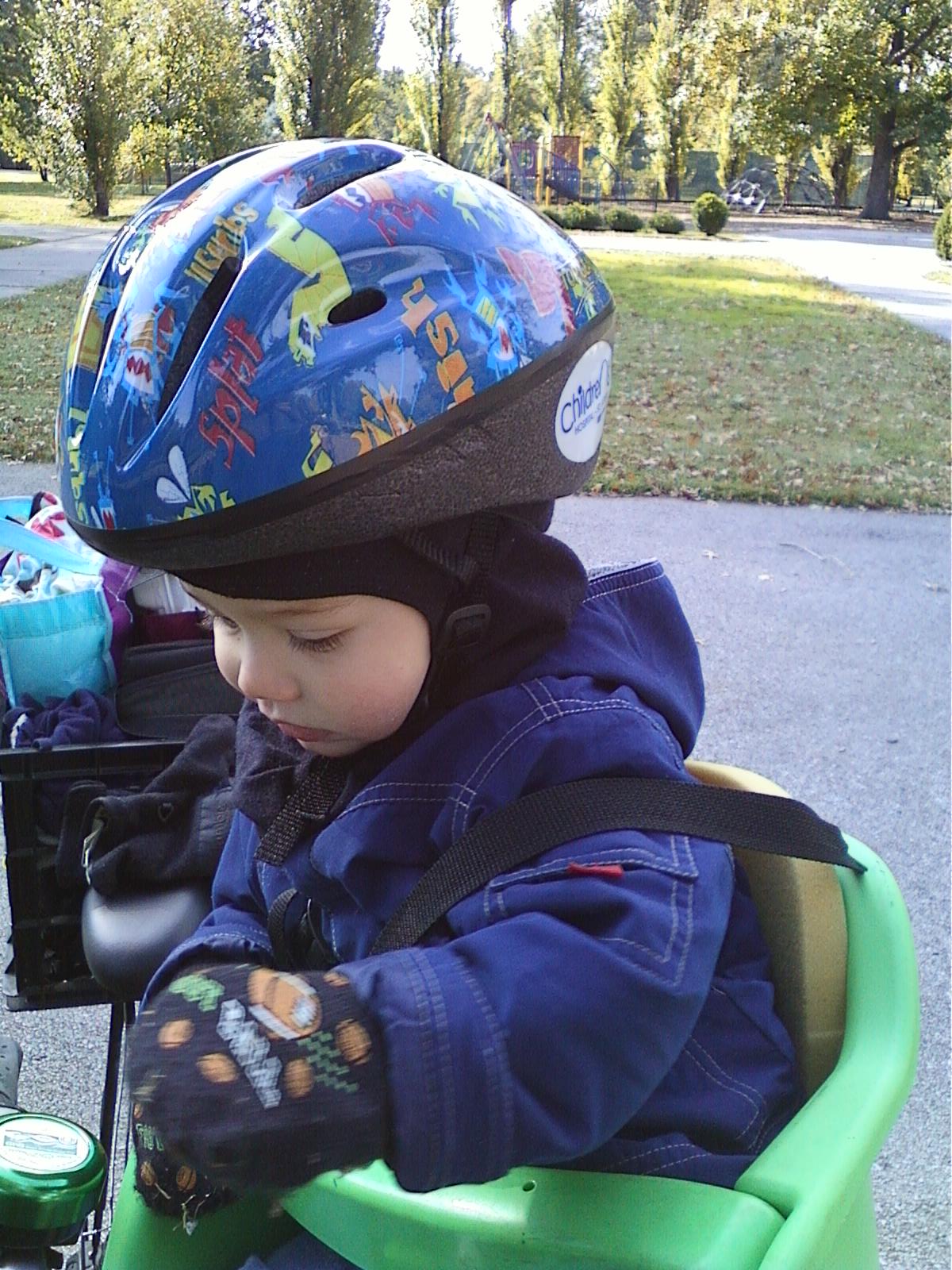 In fact, he may have found it a bit TOO cozy and comfortable, because he fell asleep on the way home.  We’ve just switched to one nap a day, and fearing that an 11:00am bike seat snooze would be disastrous to the real deal, I fought hard to keep him awake — shaking his shoulder, talking and singing to him, and ringing the bell (right in his ear!).