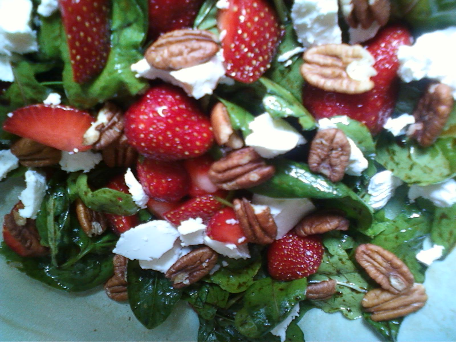 Base of spinach and arugula, tossed with sea salt and good balsamic vinegar, then allowed to sit and wilt slightly. Topped with sliced (and lightly sugared) strawberries, toasted pecans, goat cheese and a drizzle of olive oil. Yum, just what I had in mind!