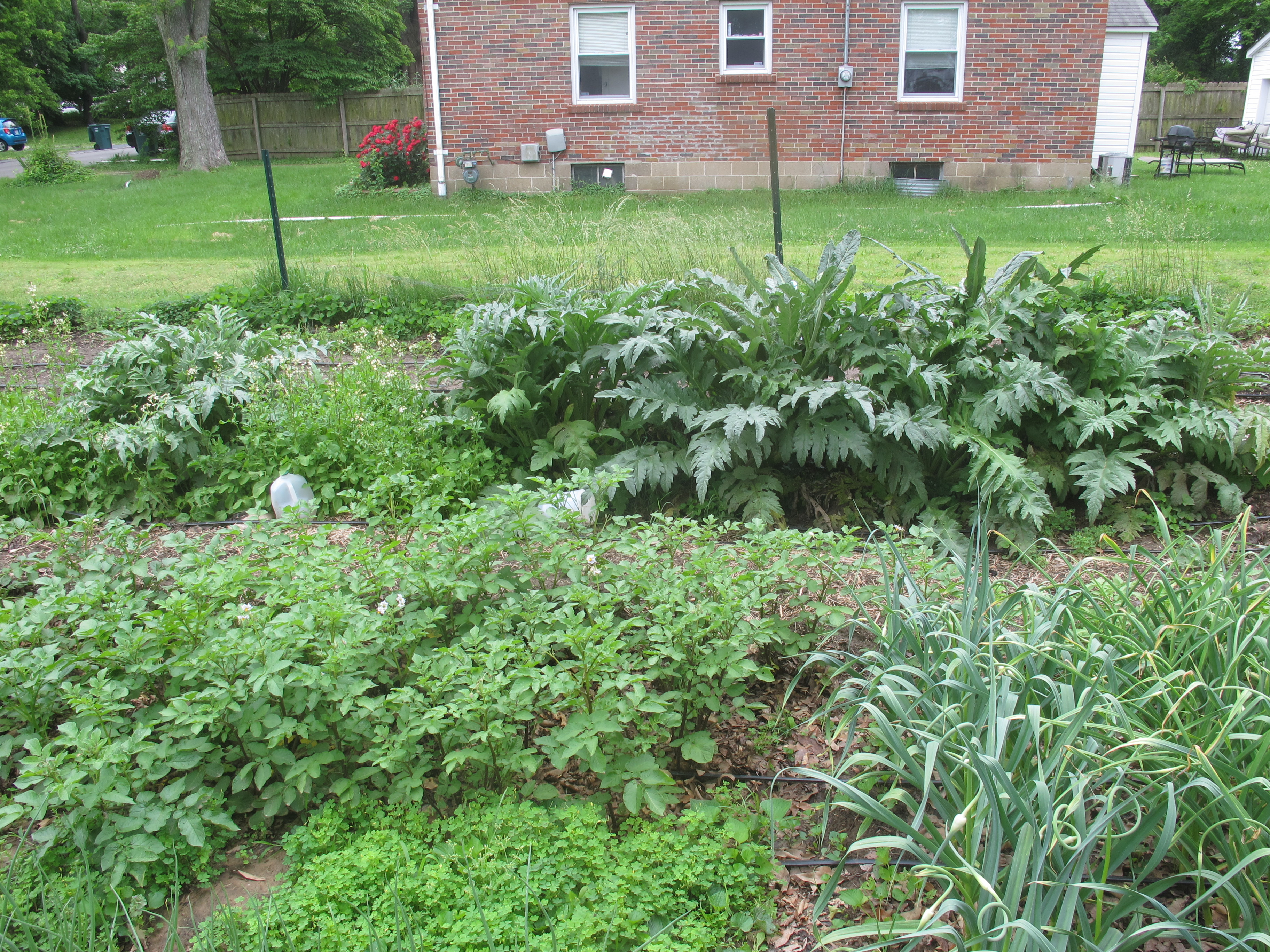 We’re currently harvesting artichokes (those crazy, spiky Jurassic-looking plants in the background — see here for artichoke serving suggestion) and the garlic (on the right) is almost mature.