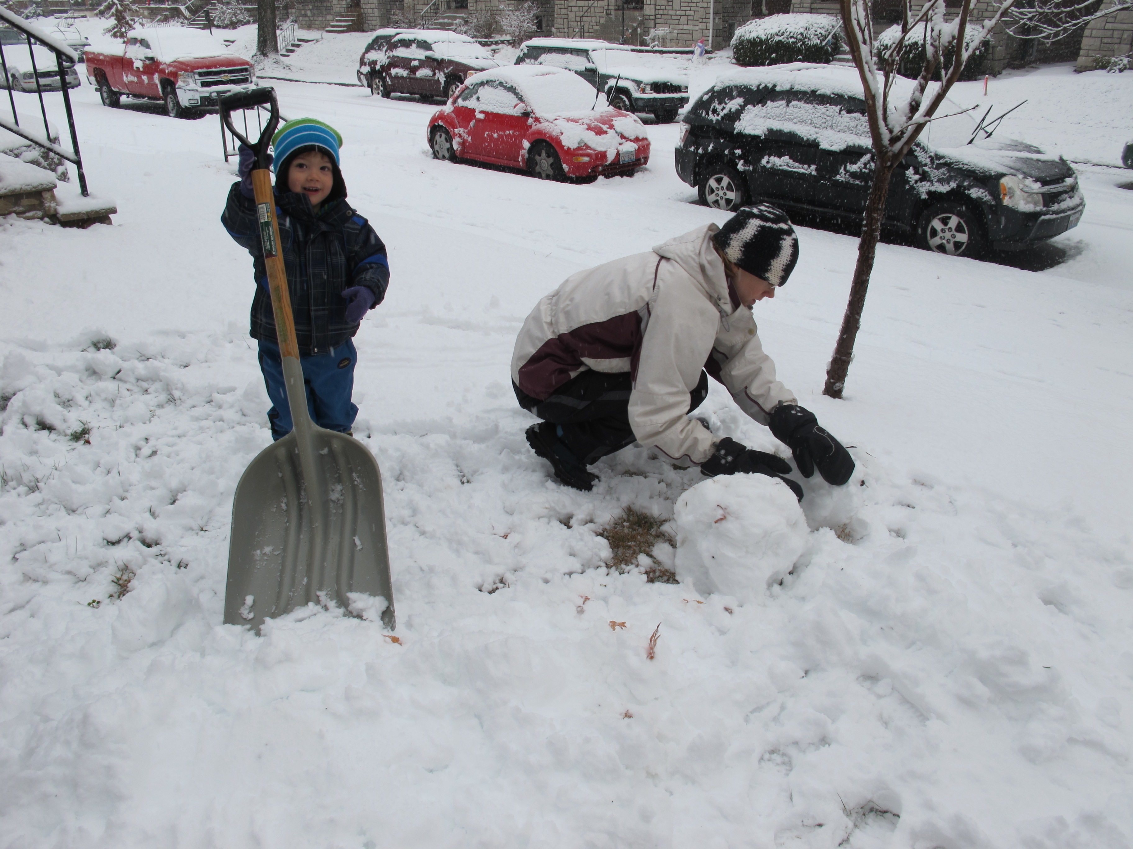 . . . to shovel and make a snowman. Our shoveling efforts paid off. The people on our side of the block (the side that’s in shadow all day this time of year, with no sun to aid melting) who didn’t shovel had snow- and ice-covered sidewalks as late as yesterday morning, but our walk stayed clear.