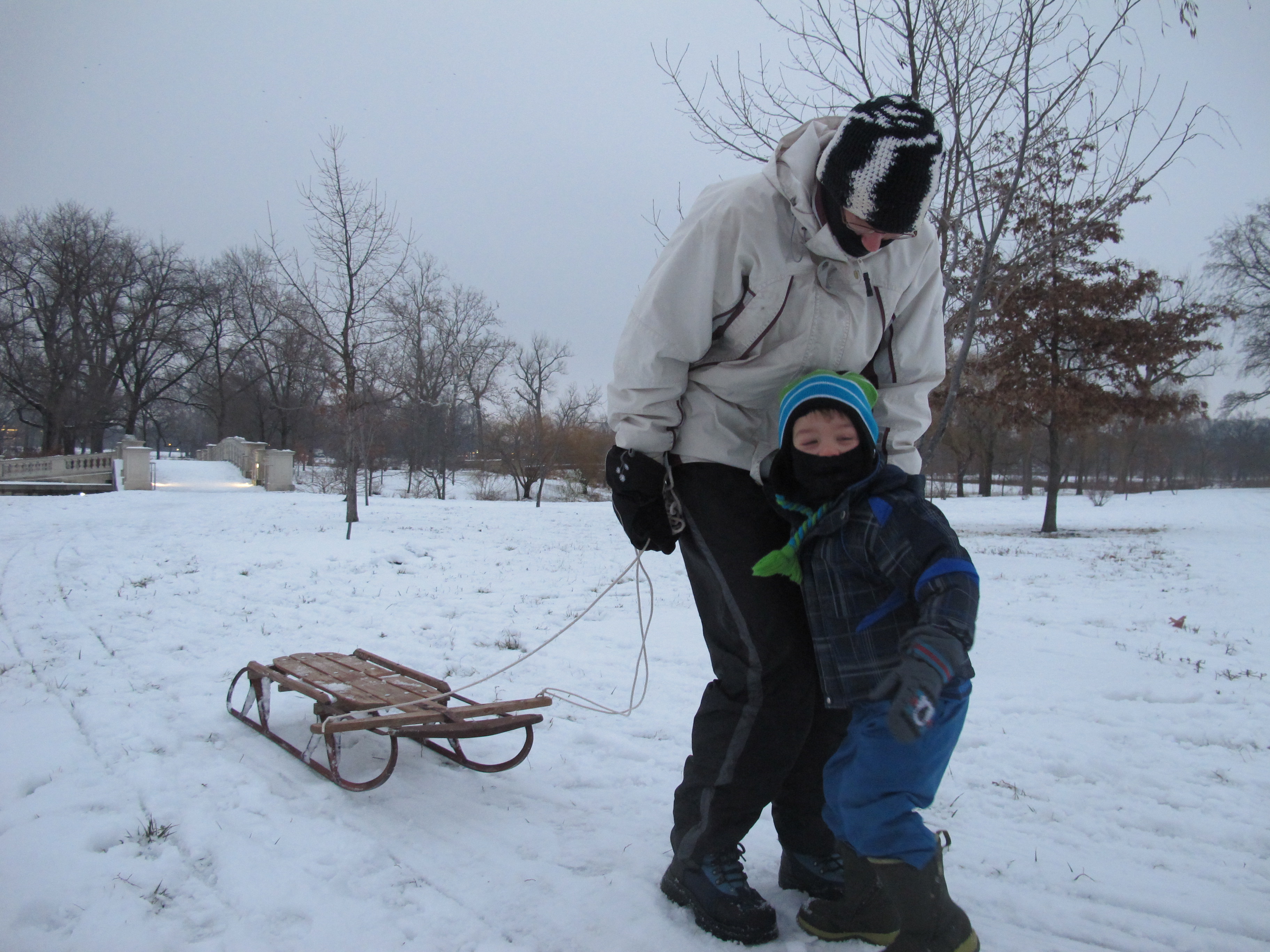 Gabriel’s first time sledding on Art Hill was a success. The three of us managed to pile onto our old school runner sled, and Matthew safely steered us away from the hay bales and water at the bottom of the hill.