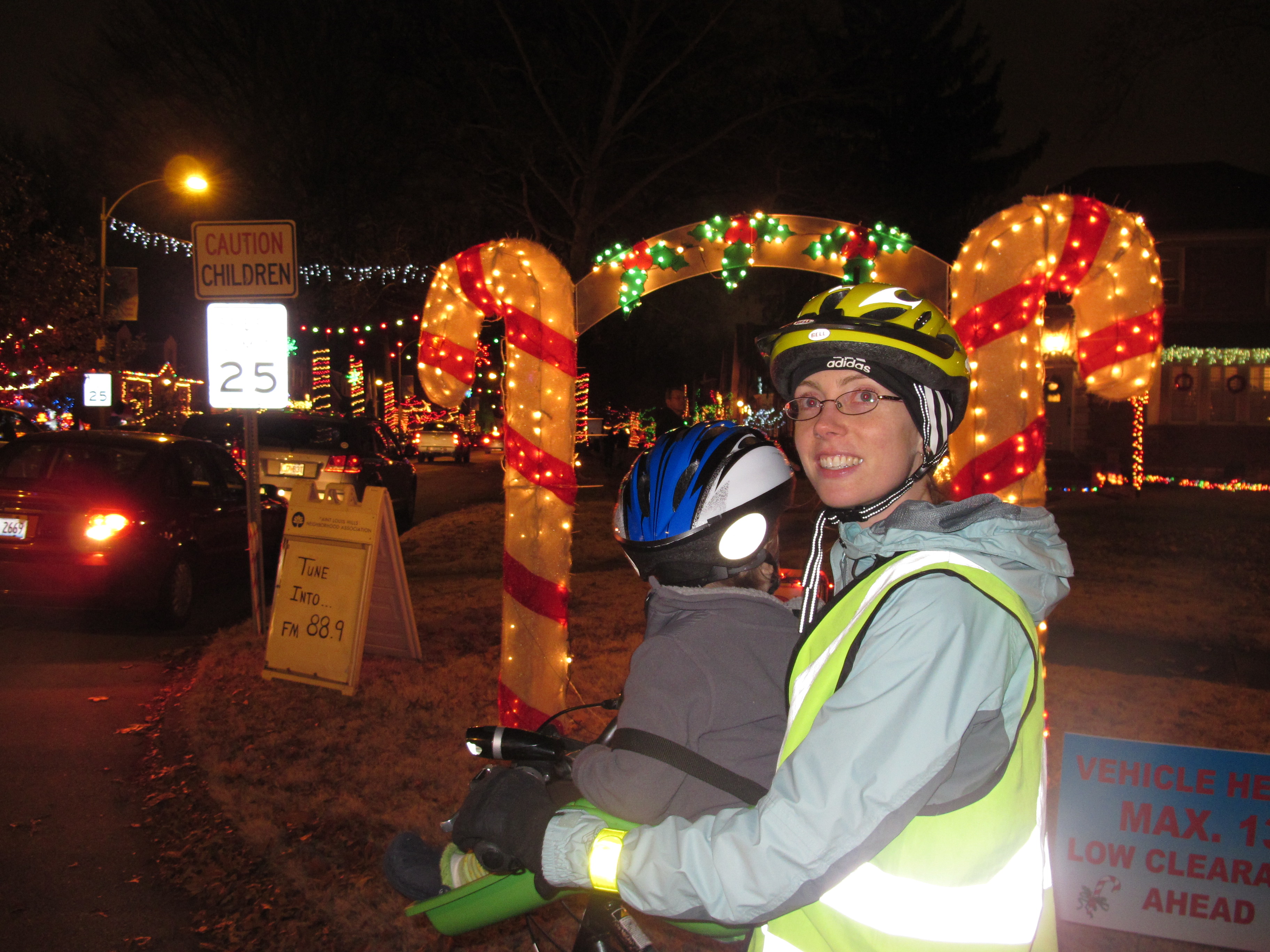 We snapped a few pictures (which of course don’t do it justice, though they show off my blinding reflective vest) and joined the queue of slowly moving vehicles on Candy Cane Lane. I felt like I was doing a “slow bicycle race” for most of the block.
