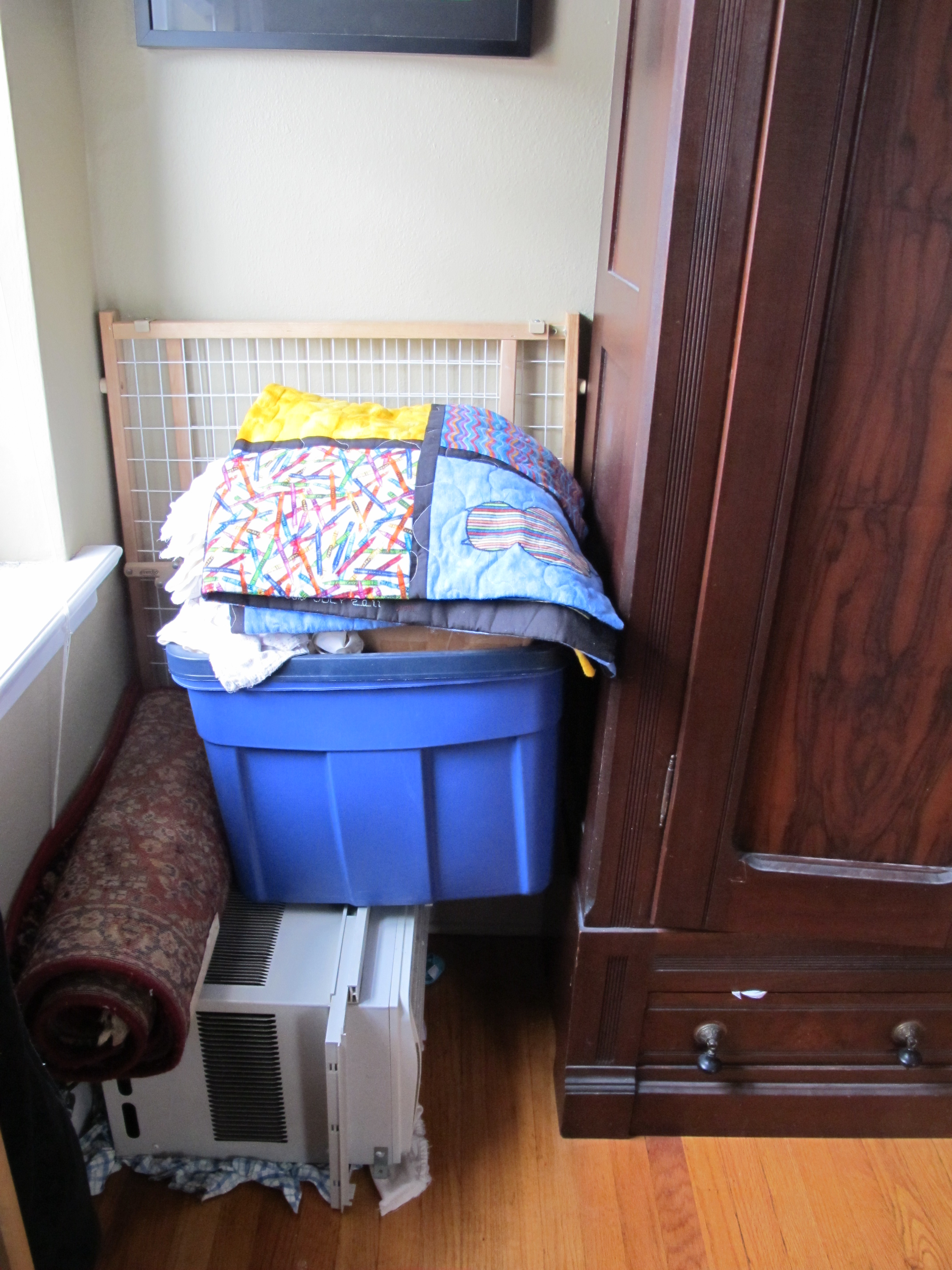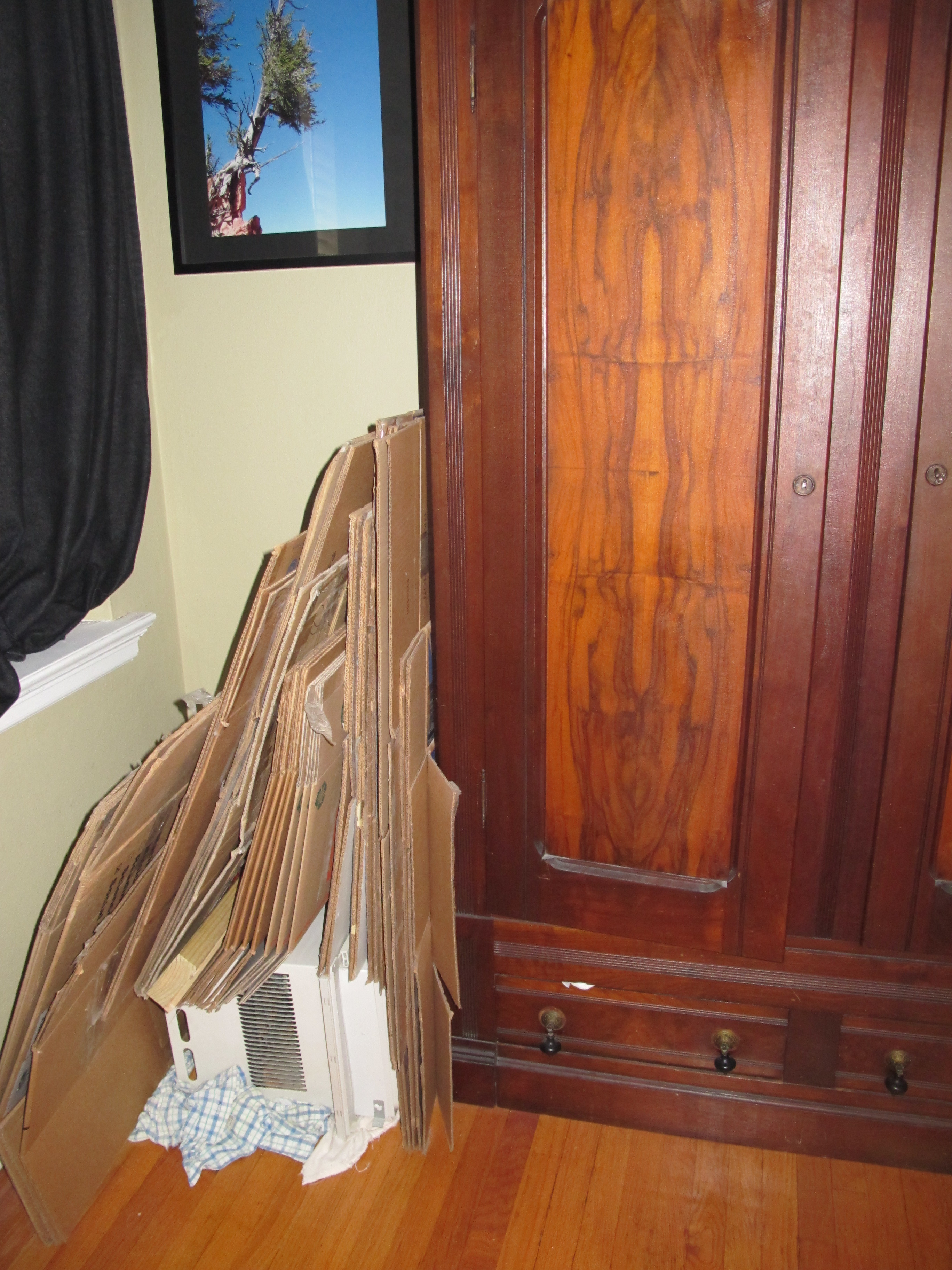 Several trips carting boxes down two flights of stairs (empty, broken down boxes are so awkward and unwieldy to move — gah!), followed by some cleaning and rearranging in the bedroom, and voilà! This little project won’t be completely finished until we get the window AC unit out of there, but somehow I don’t think I’ll have any immediate takers on that item with our current arctic weather. At least all of the dust is gone, and I can fully open the curtain in that corner.