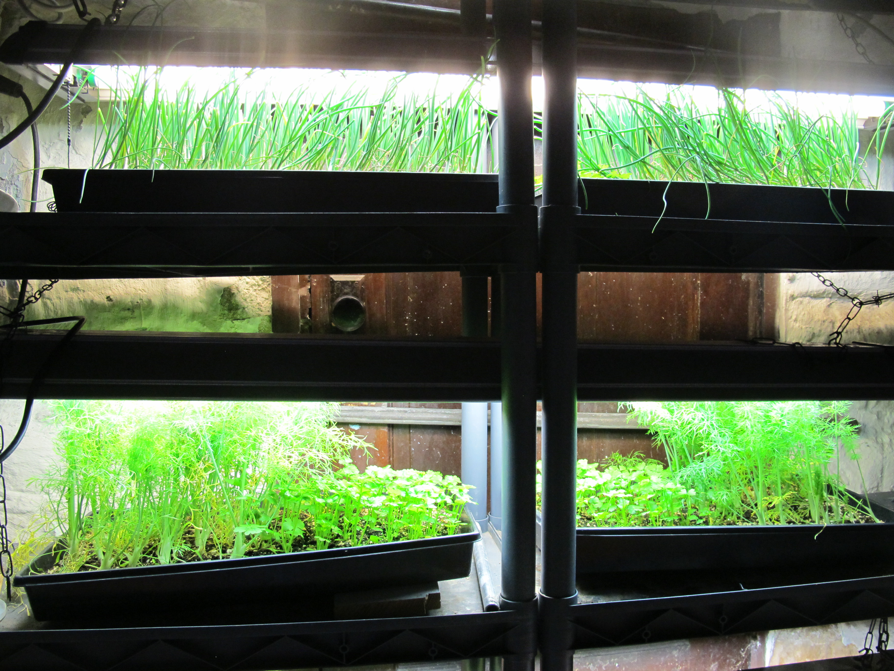 I have nine trays of seedlings growing, including onion starts and fennel seedlings that are itching to be transplanted outside. Nine trays exceeds our grow light capacity by one tray, so the leeks are hanging out on the sun porch, along with a bit of lettuce.