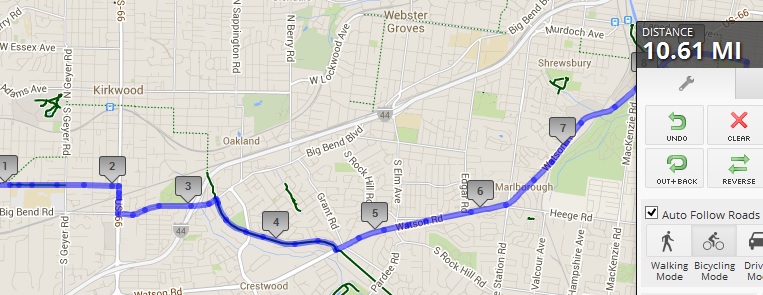 Here’s a snapshot of Saturday’s route. Connecting to Grant’s Trail was easy. I rode on Big Bend (arterial) for a relatively short stretch to connect to the trail, just after mile marker 3 on the map. I was on the trail for about a mile (between Big Bend and Watson Road), and I must say, it was rather lovely. I’ve heard other cyclists complain that the trail is packed to the point of being difficult to ride on weekends, but that was not the case, even on a lovely Saturday afternoon at the end of April.