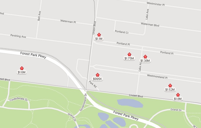 To be fair, this is a VERY desirable part of St. Louis City (and one of the only neighborhoods in the city with this concentration of highly priced real estate), but you can see that for my CL seller to have a similar house in an urban, rather than suburban area, it would likely cost more than twice as much (though the historical homes mapped here are also much more home than the subdivision houses will ever be).