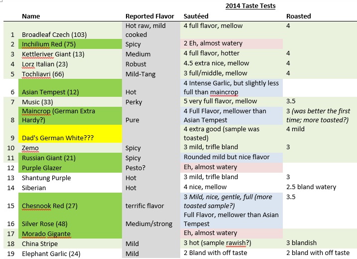 That said, I think this is a reasonable testing and comparison. I didn’t find the wine-like distinctions many garlic growers report in my cooked samples. I don’t eat raw garlic (other than small amounts in pesto, hummus, etc.), so I didn’t bother tasting it that way. I did find tastes that varied in being more or less full flavored, more or less hot, or neither and just downright watery.