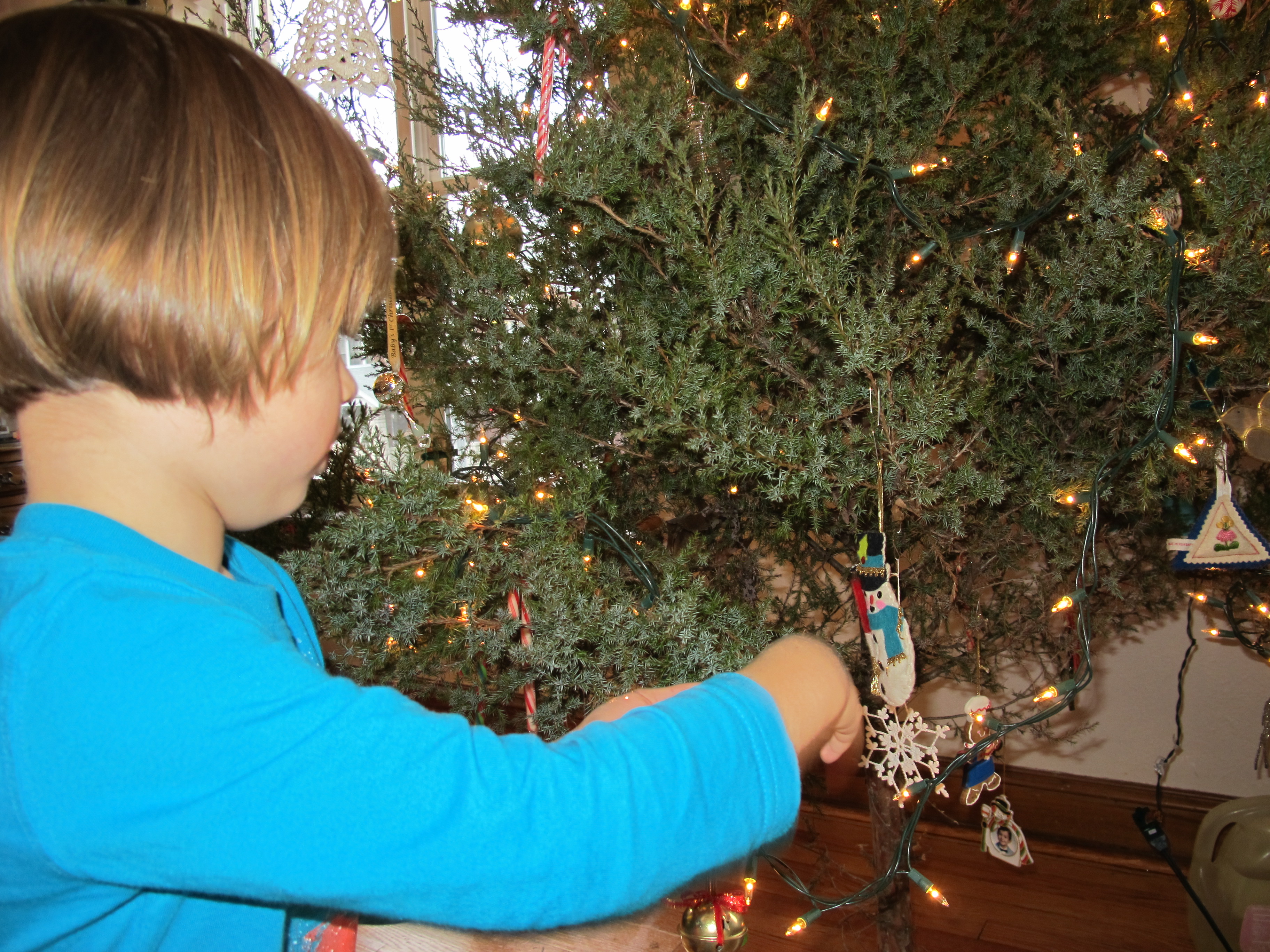 We have a nice assortment of kid-friendly (read: sturdy) ornaments for the lower branches. (Tip: if you run out of ornament hooks, unbent paperclips work very well.)