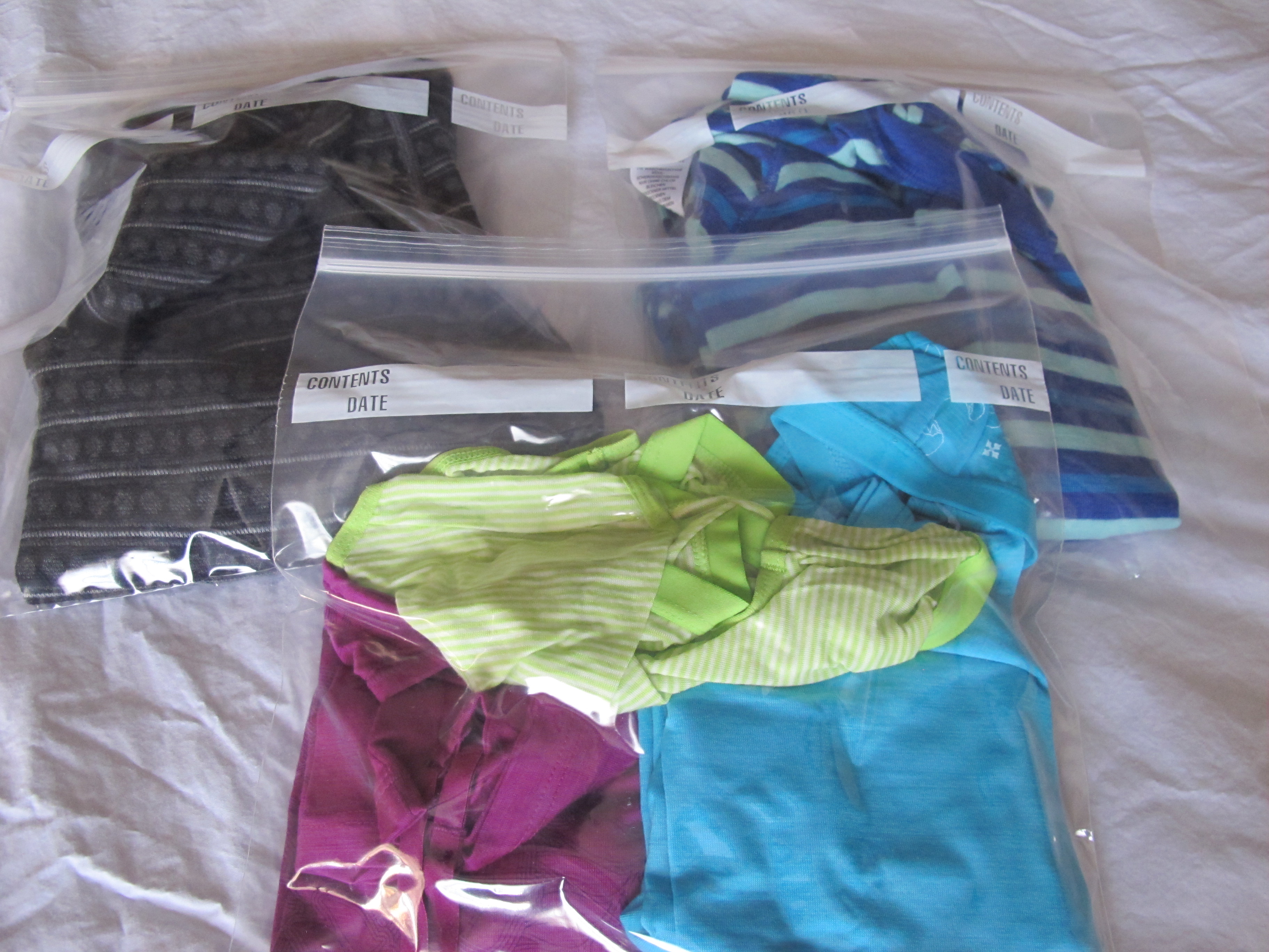• Bagging.  I’m storing all of the clean items in plastic freezer bags.  Theoretically, moths should not be attracted to clean wool (it’s the body oils and food scents that they like), but I’m not taking any chances.