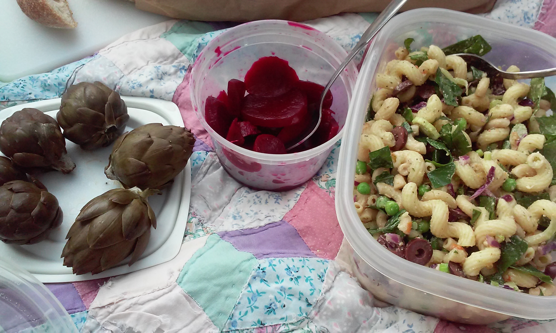 Whitaker nights mean picnics and picnic food.  Last week I whipped up a pasta salad full of veggies, including scapes, kale, and fennel from the garden, plus sides of pickled beets and artichokes.