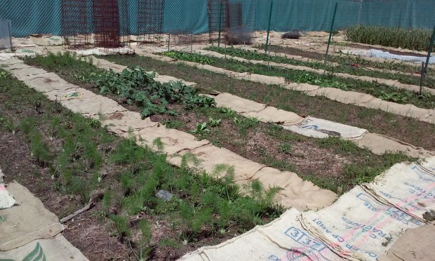 After a misguided attempt to have grass paths in between the beds (too much work!), we’ve reverted to our coffee bean bag pathways.  I’m interested in trying a biodegradable weed barrier that I read about in Mother Earth News (like this).  I assumed that it would be prohibitively expensive for the amount we’d need, but for a little over $100, we could cover almost all of our vegetable beds, and if it works, that would be money well spent!