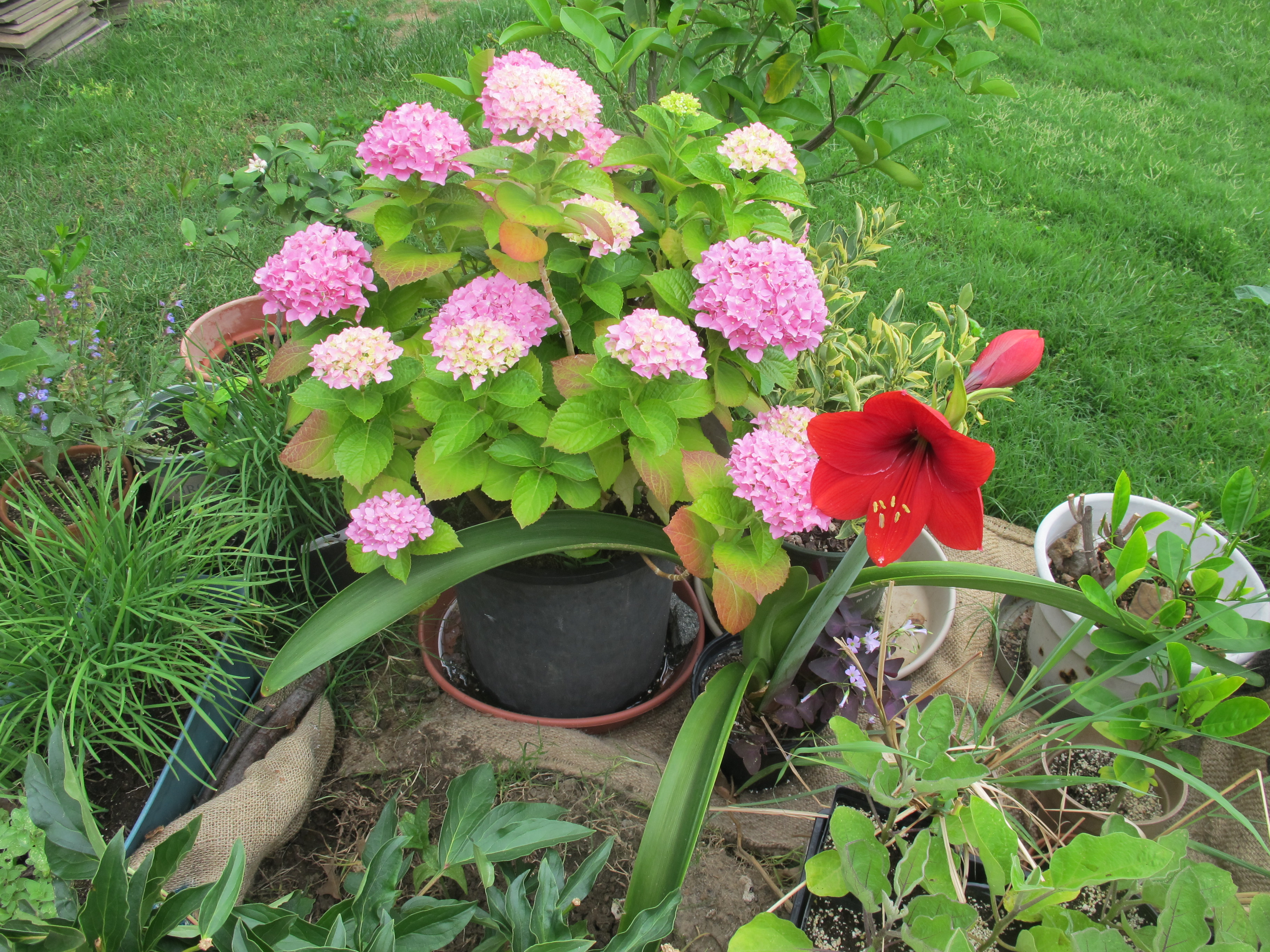 Flowers! We received the hydrangea as a gift from my aunt and uncle when Gabriel was born. We don’t want to put it in the ground until we’re somewhere permanent — fortunately, it seems happy enough in it’s pot. Amaryllis photo bomb — this guy already bloomed once this year (a quadruple blossom!), but apparently that was not enough; it decided to send up another flower shoot.