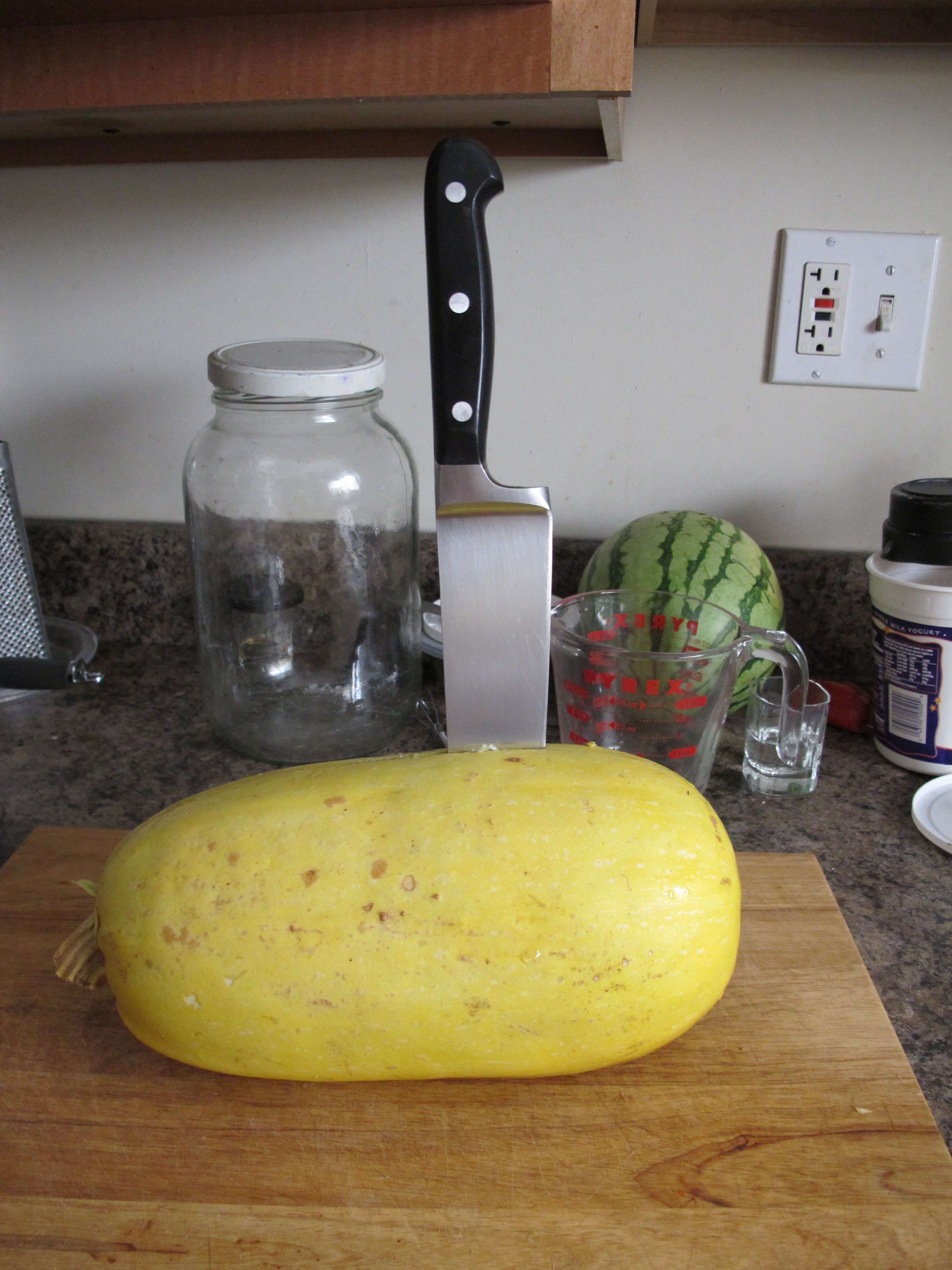 An axe or circular saw would have been an appropriate tool for splitting this spaghetti squash. Fortunately, that was the hardest part. I transformed the squash into a dish that was a huge hit at the vegetarian potluck last night 🙂 (stay tuned for the recipe, another simple and delicious creation).