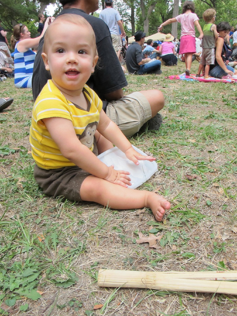 After eating, we wrapped up our trip with a visit to the main stage, and Gabriel made friends with the man sitting next to us and jammed out on his “drum.”