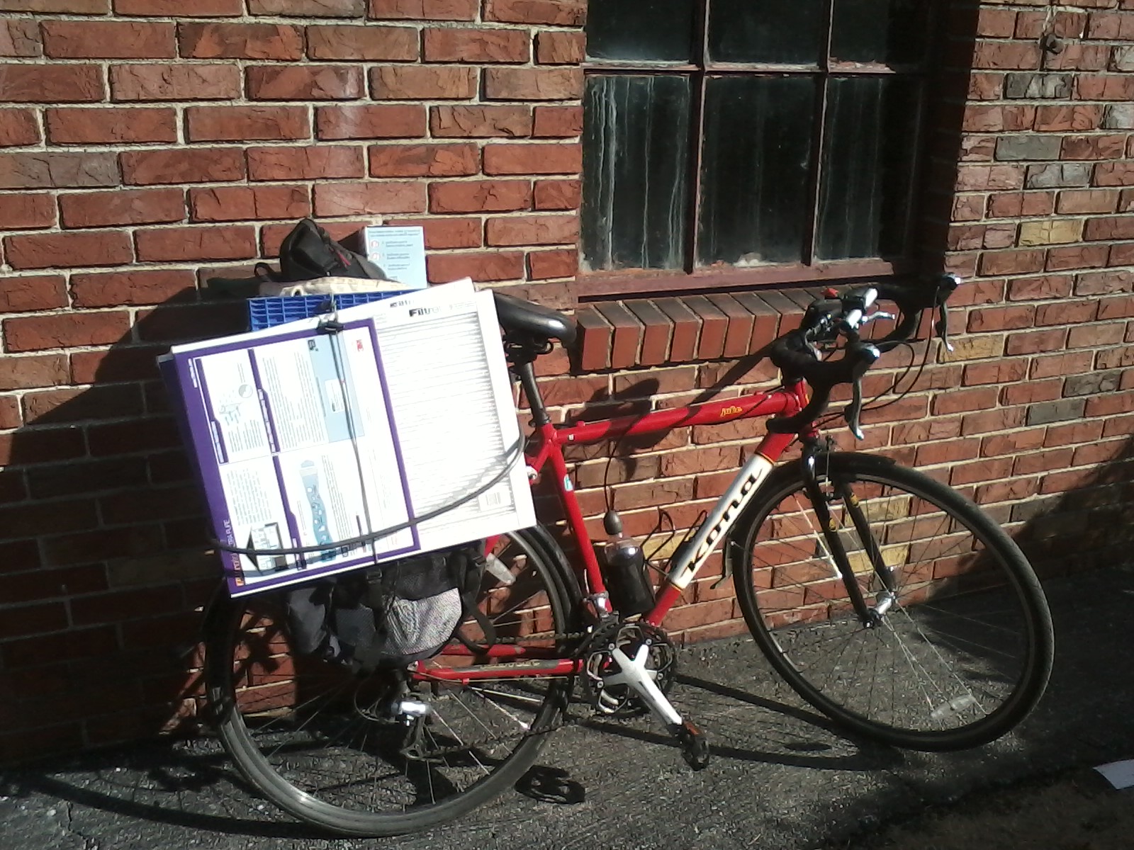 At any rate, it will be nice to have the cargo capacity of the longtail. My decision to buy not one, but two furnace filters at the store today (they were on sale!), seemed great until I reached my bike and realized the diagonal of my milk crate is the perfect size for ONE filter.