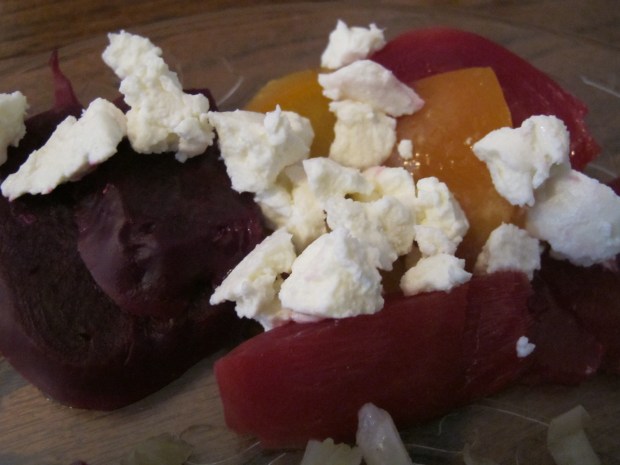 The garden supplied almost all of the ingredients for Wednesday night’s dinner. Boiled beets — some cubed for part of the main dish, some thinly sliced for a side with goat cheese.