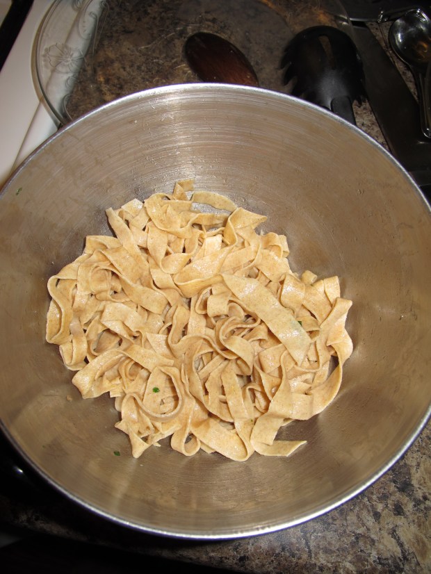 I’m happy to announce that our pasta making adventures continue, and I have a recipe for you. While searching for whole wheat pasta recipes for our first attempt, the mention of using alternative flours*, such as spelt and farro, caught Matthew’s eye.