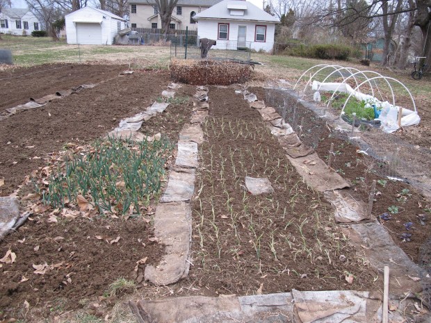 Once the soil was prepped, we planted six rows of potatoes, a bazillion onions, some cruciferous seedlings (sadly, we had to buy these, as ours bit the dust once again, but we have a plan of attack for next time), and artichoke seedlings.